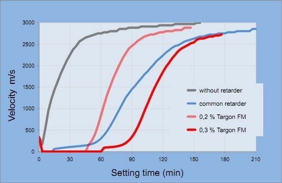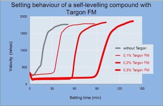 該圖表明使用 Targon FM 作為緩凝劑,可以按添加量的比例延長施工時(shí)間,但并不影響流平材料的固化。